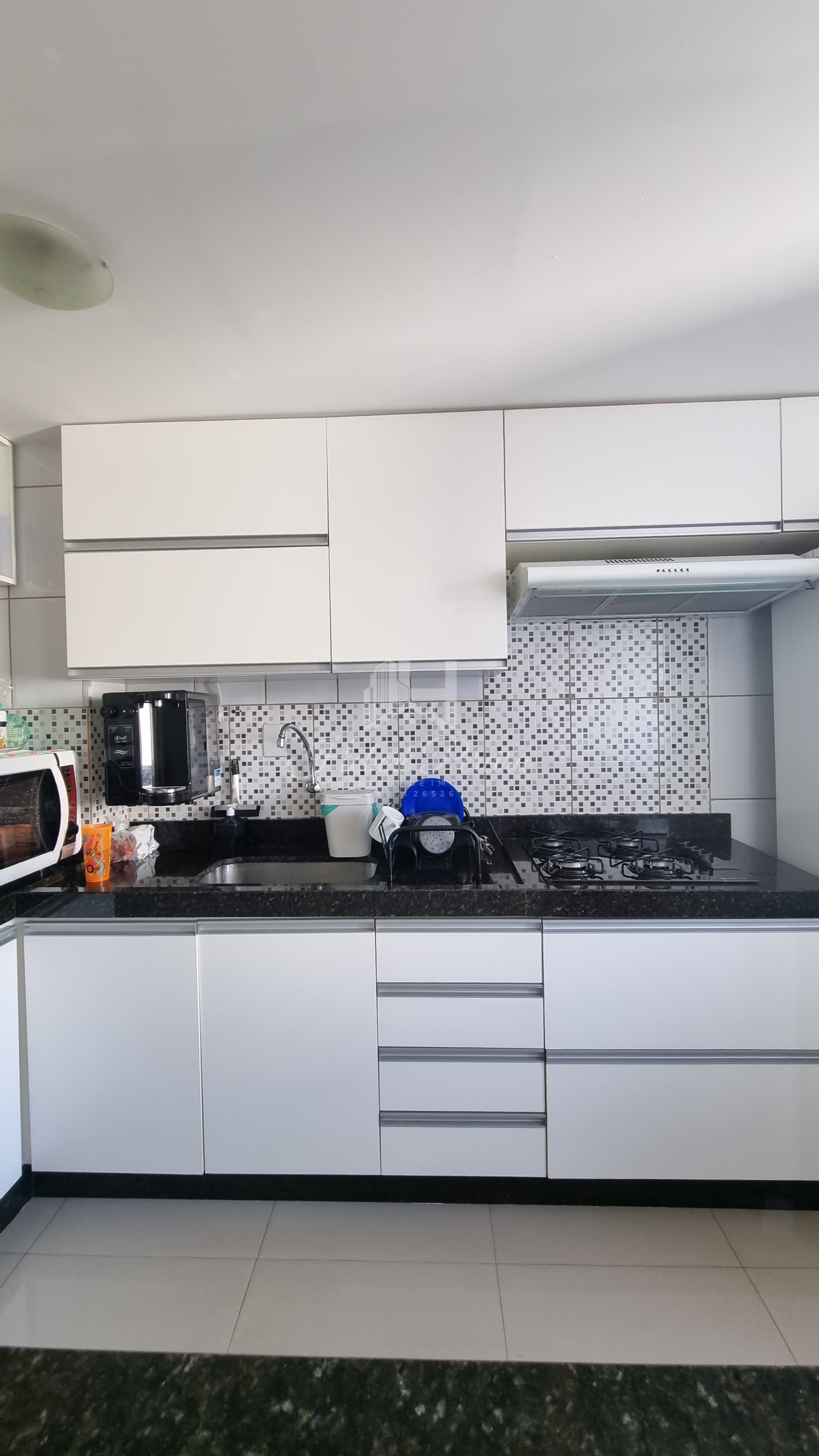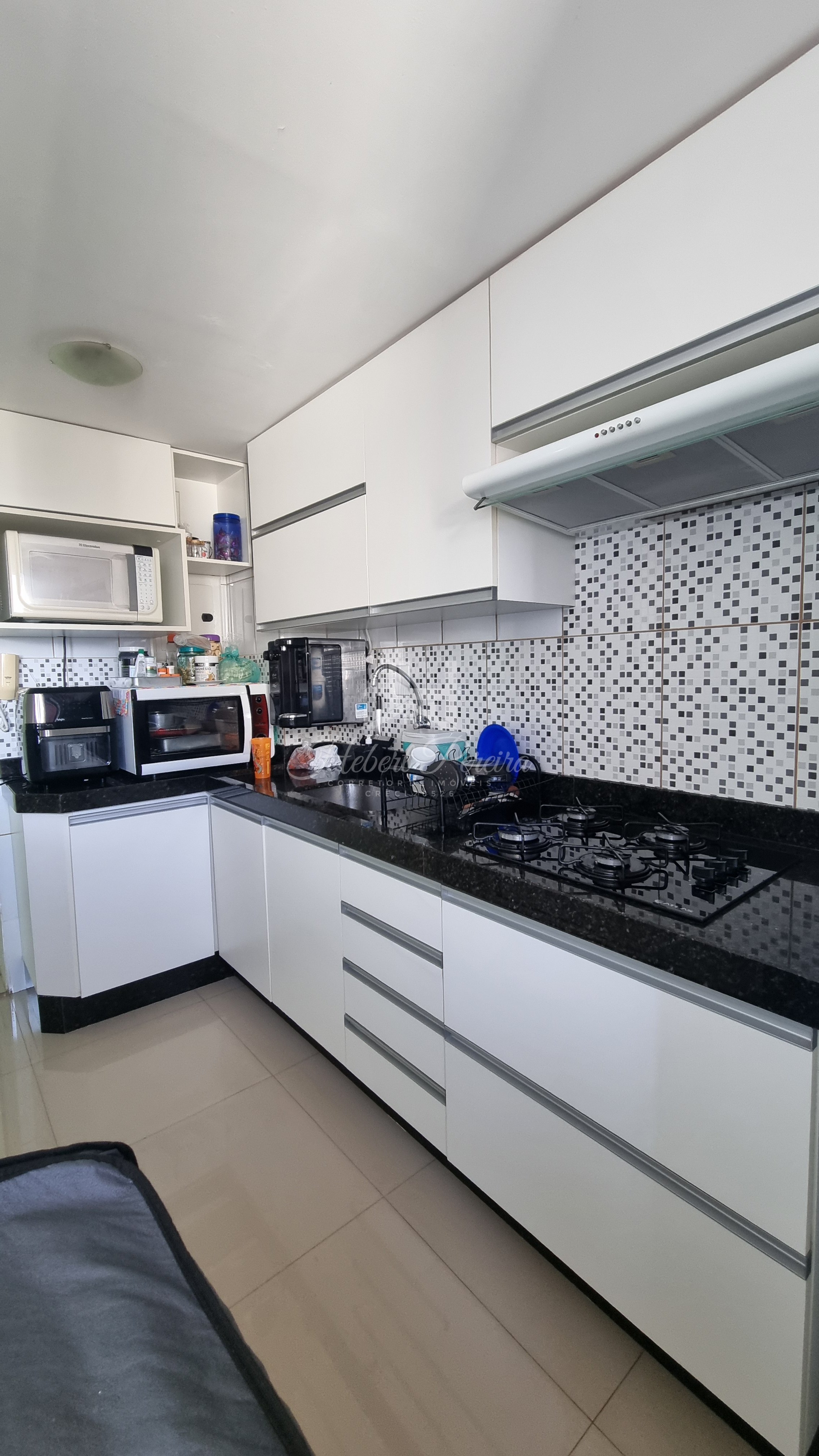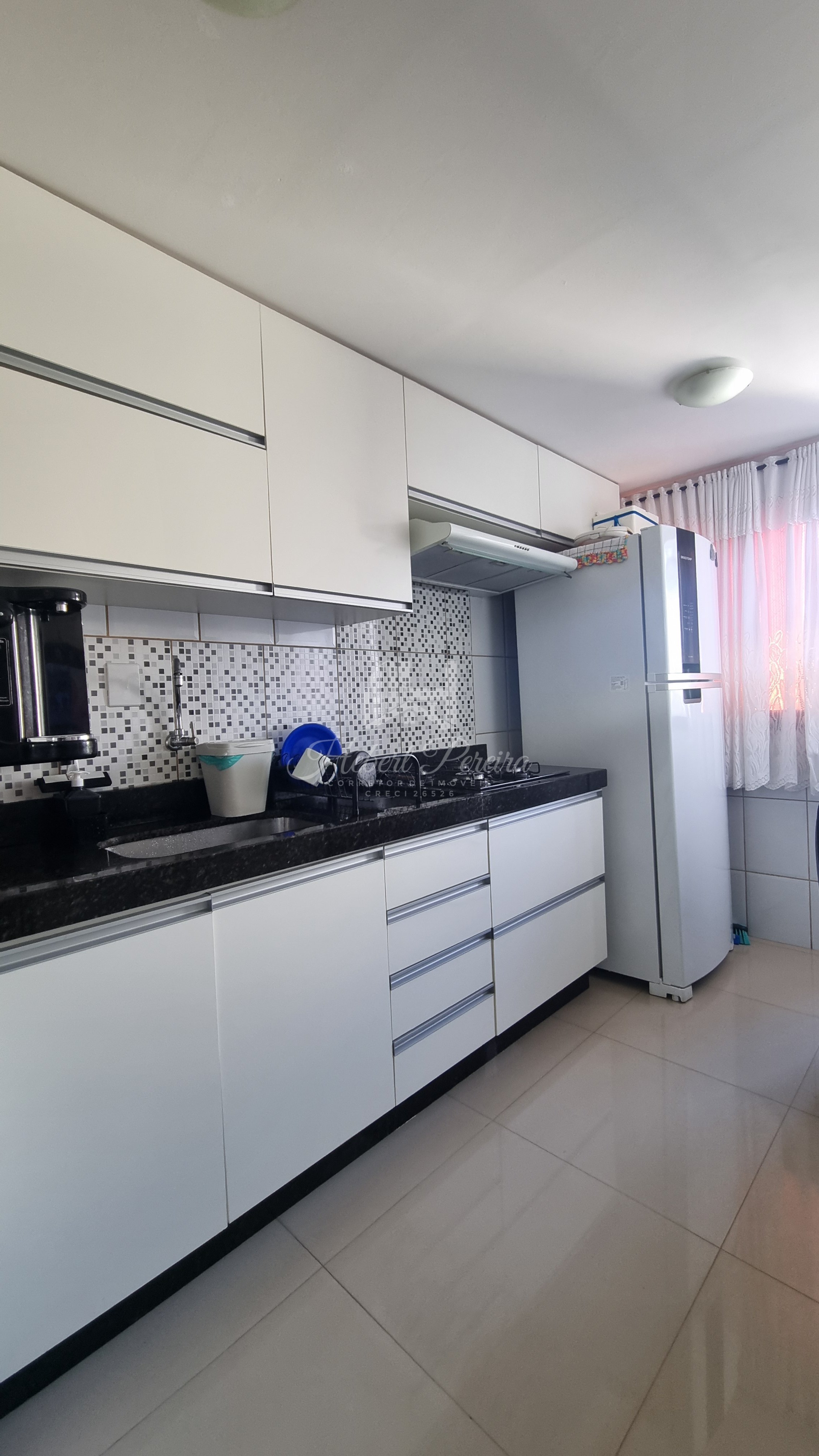 São dois quartos sendo uma suíte, sala ampla com dois ambientes integrada a cozinha que possui bancada e armários planejados.