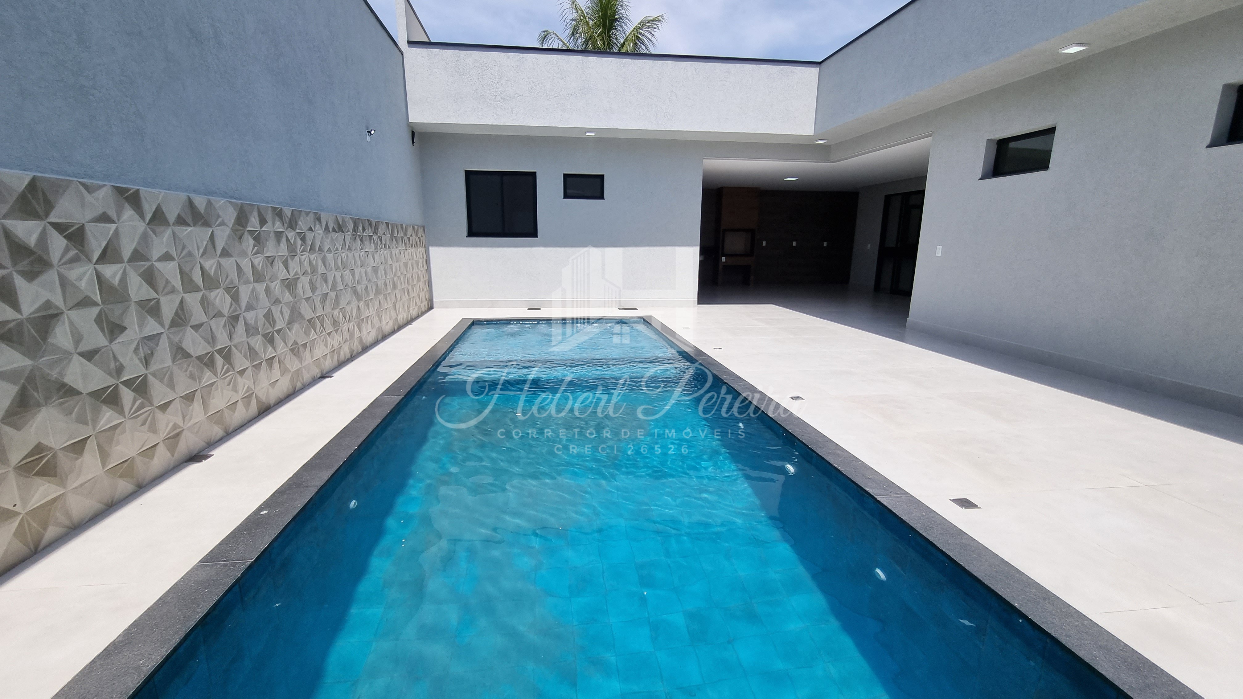 Casa solta no lote, com corredores nas laterais, piscina nos fundos.